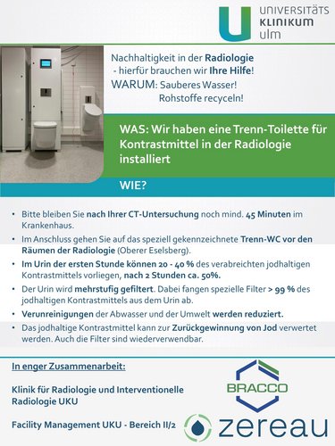 Als erste radiologische Einrichtung in Deutschland setzt das Universitätsklinikum Ulm (UKU) ein speziell entwickeltes Toilettensystem zur gezielten Filtration jodhaltiger Kontrastmittel ein. Ziel des innovativen Projekts ist es, einen bislang kaum vermeidbaren Eintrag von Kontrastmitteln in die Umwelt deutlich zu reduzieren und damit einen wichtigen Beitrag zu nachhaltiger und umweltbewusster Hochleistungsmedizin zu leisten. Mit der Installation des Systems übernimmt das UKU eine Vorreiterrolle im Bereich der „grünen Radiologie“ und geht damit einen weiteren wichtigen Schritt in Richtung nachhaltiger und umweltbewusster Medizin.
