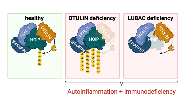 Linear ubiquitin chains play a crucial role in regulating inflammatory processes in the human body (Zinngrebe J. et al., EMBO Reports, 2014). These chains are assembled by the Linear UBiquitin chain Assembly Complex (LUBAC), which consists of SHARPIN, HOIL-1, and HOIP, and are specifically removed by the deubiquitinase OTULIN (OTU Deubiquitinase with LINear linkage specificity). Dysregulation of linear ubiquitination – e.g., due to mutations in LUBAC or OTULIN – can lead to severe autoinflammation and/or immunodeficiency in affected patients (Zinngrebe J. et al., EMBO Mol Med, 2022). Although adipose tissue is frequently affected, the underlying molecular mechanisms remain poorly understood. Gaining deeper insights into these processes may open up new therapeutic avenues for affected patients.