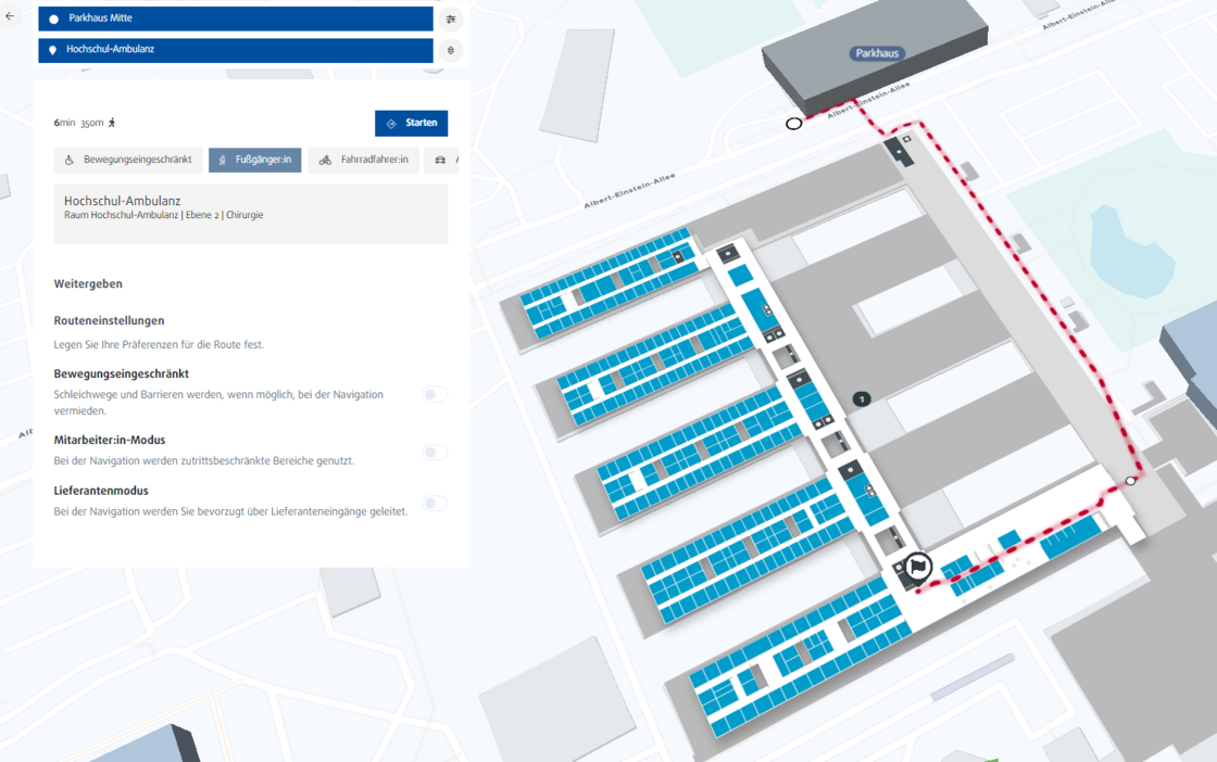 At Ulm University Hospital you can use the in-house navigation system from Catchup. The navigation system helps you find your way around the hospital. It guides patients, visitors and staff through step-by-step instructions - from the starting point to the destination - and thus helps them to find their way around the hospital quickly. The navigation platform is available free of charge and can be used via the Ulm University Hospital's WLAN ("Patient Internet").