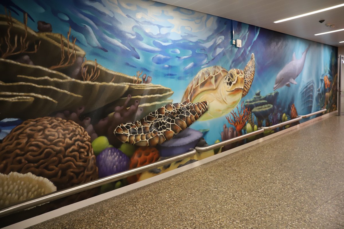Im 2. Untergeschoss der Klinik für Kinder- und Jugendmedizin des Universitätsklinikums Ulm (UKU) ist ein echter Hingucker entstanden. Seit kurzem ziert ein überdimensionales, farbenfrohes Unterwasser-Graffiti eine Wand im Flur der Klinik. Den jungen Patientinnen und Patienten soll so unter anderem der Weg zur bevorstehenden Operation etwas angenehmer gestaltet werden.