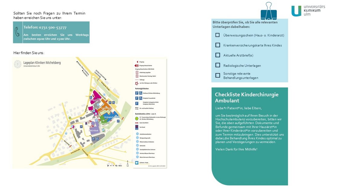 Bitte rufen Sie uns unter folgender Telefonnummer 0731 500-53777 an oder schreiben Sie uns eine E-Mail an kinderchirurgie@uniklinik-ulm.de.