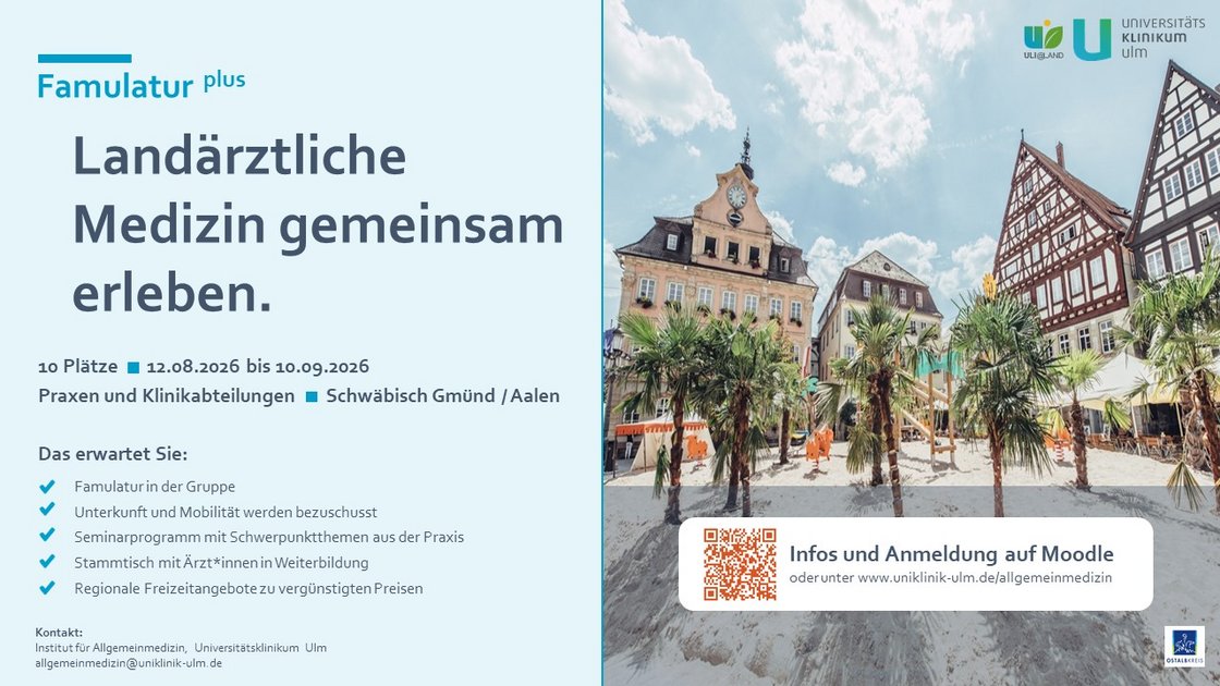 Im Rahmen unserer Ulmer Initiative zur Förderung der Primärversorgung in ländlichen Regionen "ULI@Land" haben wir in Zusammenarbeit mit unseren Kooperationspartnern aus den Regionen ein neues Lernformat für Medizinstudierende ab dem fünften Semester geschaffen: Die Famulatur plus. Dieses maßgeschneiderte Famulatur-Angebot legt den Schwerpunkt auf die medizinische Versorgung in ländlichen Regionen. Insgesamt 10 Studierenden bieten wir damit die Möglichkeit, als Gruppe praktische medizinische Erfahrungen zu sammeln, Fachwissen zu erweitern und gemeinsam das breite Freizeitangebot zu nutzen. Sie haben Interesse, an der nächsten Famulatur plus teilzunehmen? Dann schreiben Sie uns eine Mail an sekretariat.allgemeinmedizin@uniklinik-ulm.de.