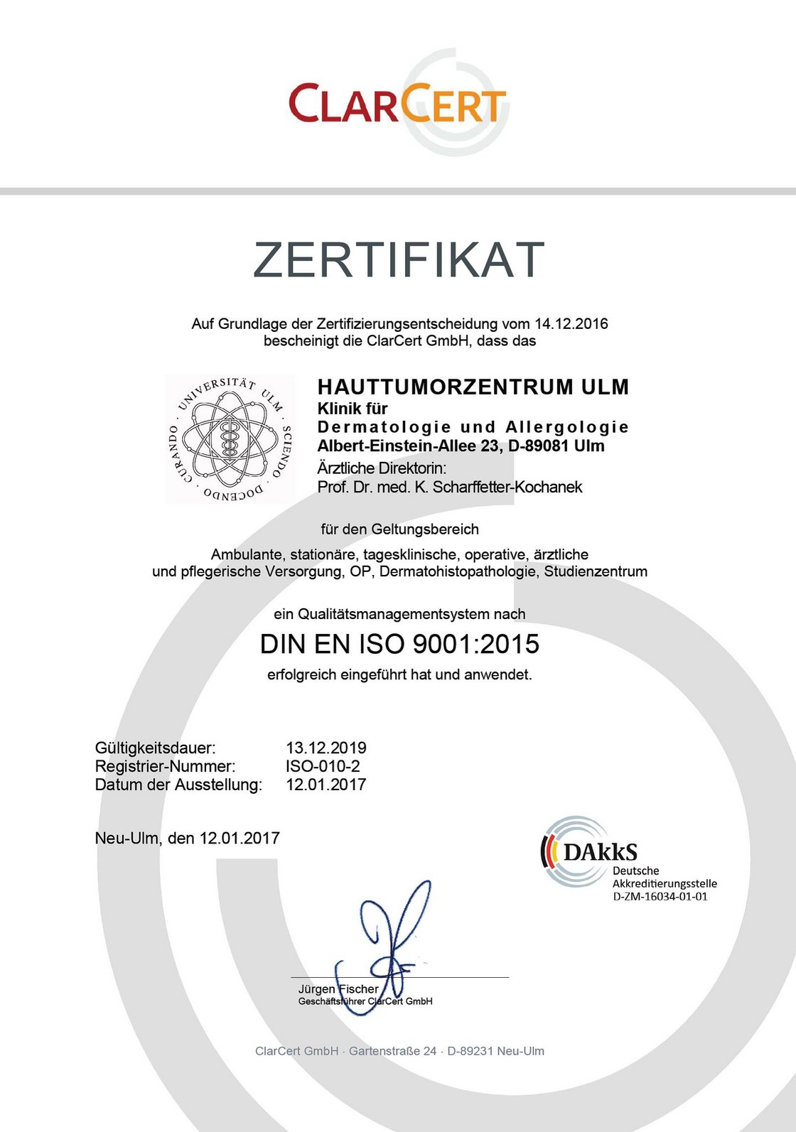 Das Gütesiegel, das bisher weniger als 35 Hauttumorzentren in Deutschland erhalten haben, gewährleistet für Hautkrebspatienten leitliniengerechte Diagnostik und Therapie. „Unsere dermatoonkologischen Oberärzte PD Dr. med. Margit Huber und PD Dr. med. Lars Alexander Schneider haben spezielle Zusatzausbildungen und langjährige Erfahrung in der chirurgischen und medikamentösen Hauttumorbehandlung, speziell geschulte Onkologiepflegekräfte kennen die Bedürfnisse von Hautkrebspatienten“, erläutert Prof. Dr. Karin Scharffetter-Kochanek, Ärztliche Leiterin des Hauttumorzentrums und Direktorin der Klinik für Dermatologie und Allergologie. "Unter dem Dach des Integrativen Tumorzentrums, des Comprehensive Cancer Center Ulm (CCCU), arbeiten wir eng mit anderen Fächern wie z. B. der Chirurgie, der Inneren Medizin oder der Strahlentherapie zusammen."