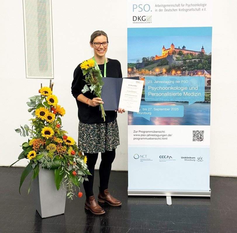 Im Rahmen der 23. Jahrestagung der Arbeitsgemeinschaft Psychoonkologie (PSO), die vom 25. bis 27. September 2025 in Würzburg stattfand, wurde Dr. Daniela Bodschwinna vom Universitätsklinikum Ulm (UKU) mit dem PSO-Nachwuchswissenschaftspreis ausgezeichnet. Geehrt wurde ihre Publikation "A psycho-oncological online intervention supporting partners of patients with cancer (Partner-CARE): Results from a randomized controlled feasibility trial”, in welcher erste Ergebnisse einer digitalen psychosozialen Unterstützung für Partner*innen von Krebspatient*innen vorgestellt wurden.
