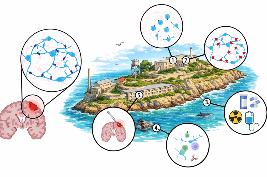In parallel, our recent translational focus addresses a second, complementary resistance principle in brain tumours: multicellular connectivity. Building on the concept that glioma cells form therapy-resistant networks, we pursue the Alcatraz Strategy—a multimodal roadmap to physically and functionally isolate tumour cells, analogous to preventing coordinated escape and repair. This framework combines (i) advanced neurosurgical approaches such as supramarginal resection targeting infiltrative network zones beyond the enhancing mass, with (ii) morphological network disruption (e.g., Meclofenamate to impair tumour microtube formation/outgrowth), and (iii) functional disconnection, including inhibition of gap-junction–mediated coupling and reduction of excitatory neuronal input into the malignant network.