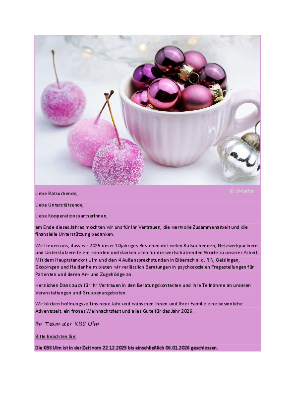 17:15 Uhr | Psychosoziale Krebsberatungsstelle Ulm (KBS Ulm), Kornhausgasse 9, 89073 Ulm (3. Obergeschoss)