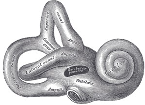 Abbildung 1. Das menschliche Innenohrlabyrinth. Linker Teil mit drei Bogengängen vermittelt Gleichgewicht, rechter Teil mit Hörschnecke („Cochlea“) vermittelt Hören. Quelle: Henry Gray, Anatomy of the Human Body, 1918, public domain.