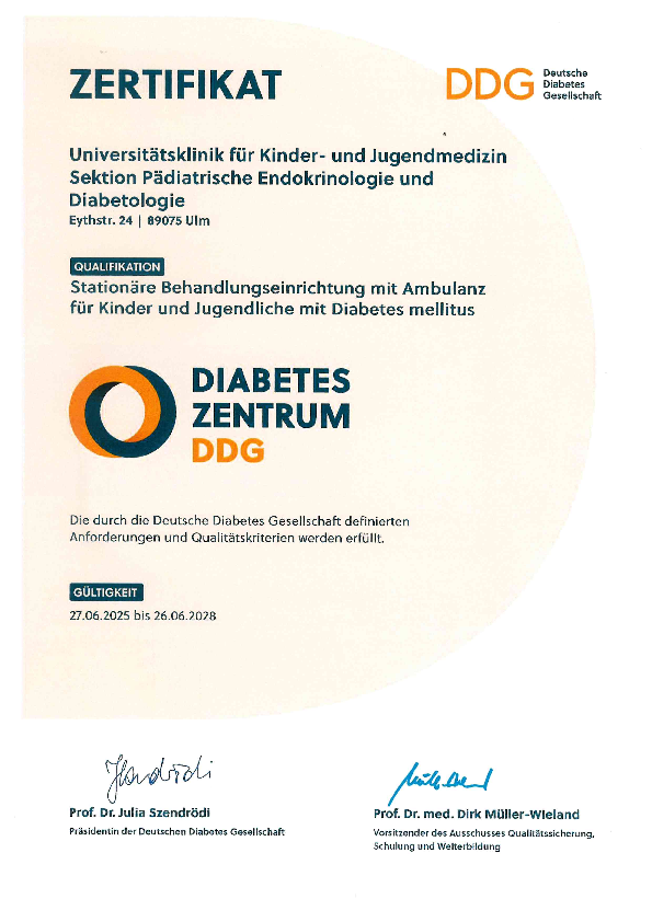 Our experienced and dedicated diabetes team, consisting of diabetologists, diabetes counsellors, nutritionists, psychologists and exercise therapists, cares for diabetes patients and their families with the aim of providing the best possible therapy and the best possible quality of life. We utilise the developments in modern diabetes technology with regard to glucose measurements (sensor technology) and continuous insulin applications (pump therapy, closed-loop systems). We are recognised as an inpatient and outpatient treatment facility for children and adolescents with diabetes mellitus in accordance with the quality criteria for a certified diabetes centre by the German Diabetes Association (DDG). We have specialised in the treatment of children and adolescents with all forms of diabetes for over 40 years. In addition to caring for patients, we work on scientific research projects to gain new insights into the causes of diabetes mellitus and to improve patient care.