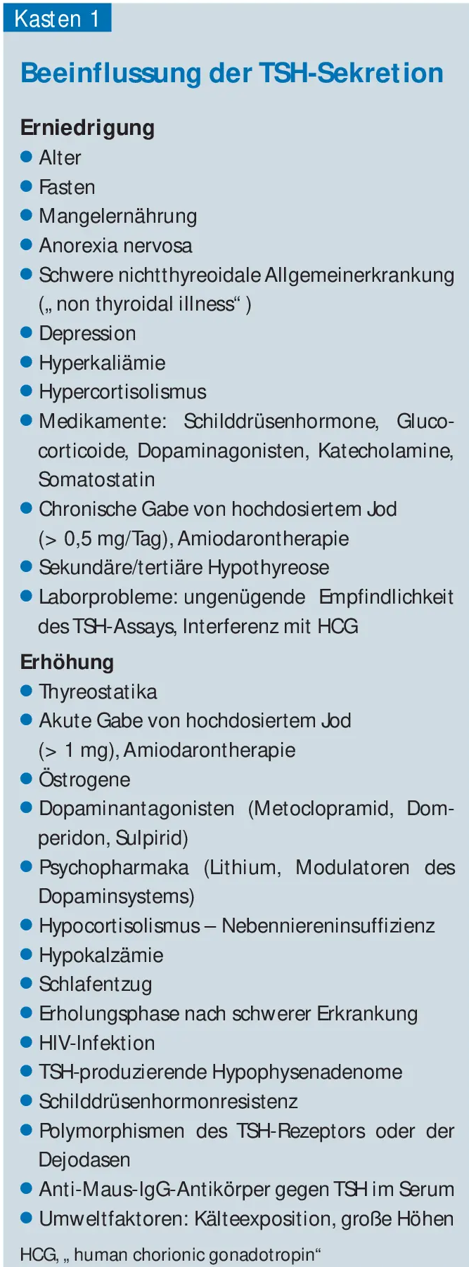 Die TSH-Sekretion wird außer durch Erkrankungen der Schilddrüse oder des Hypophysenvorderlappens durch zahlreiche weitere Faktoren beeinflusst und weist auch eine Tagesrhythmik auf.