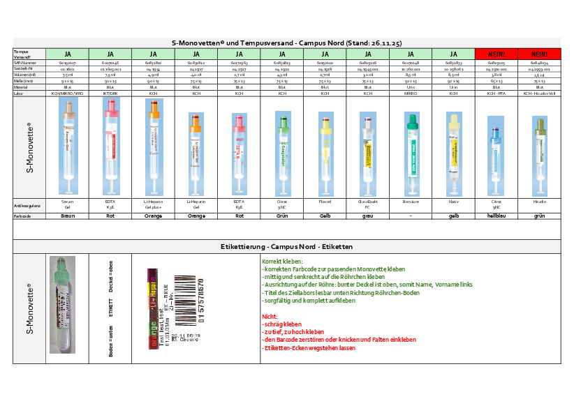 OP, Aufwachraum und chirurgische Intensivstationen haben eine zweite Station mit Direktziel „Klinische Chemie“ (Code: 1010). Nur für vitale, eilige Proben. Versand löst Notfallalarm aus.