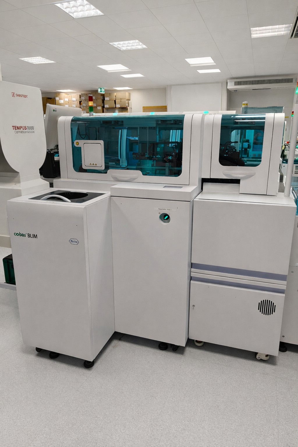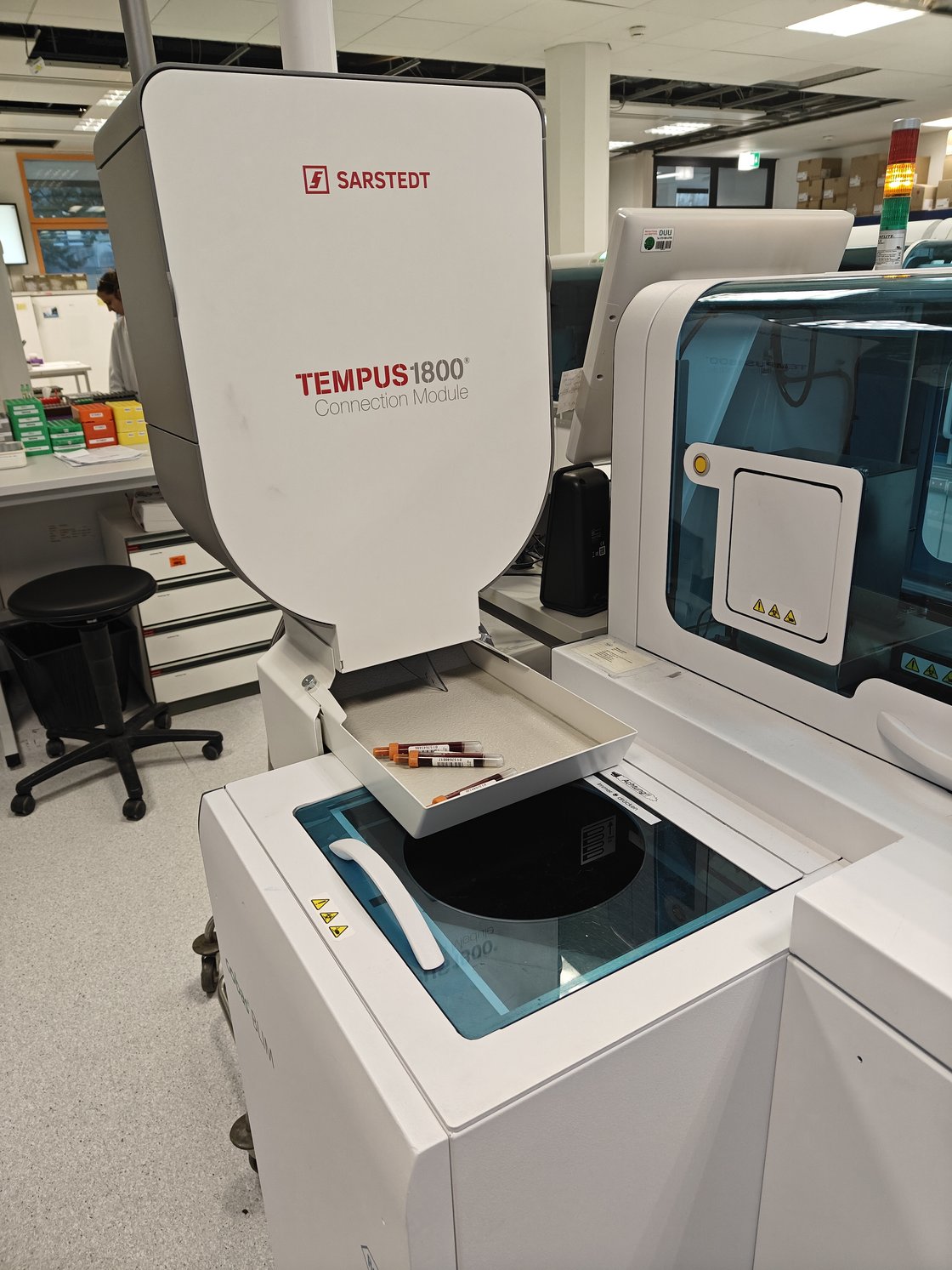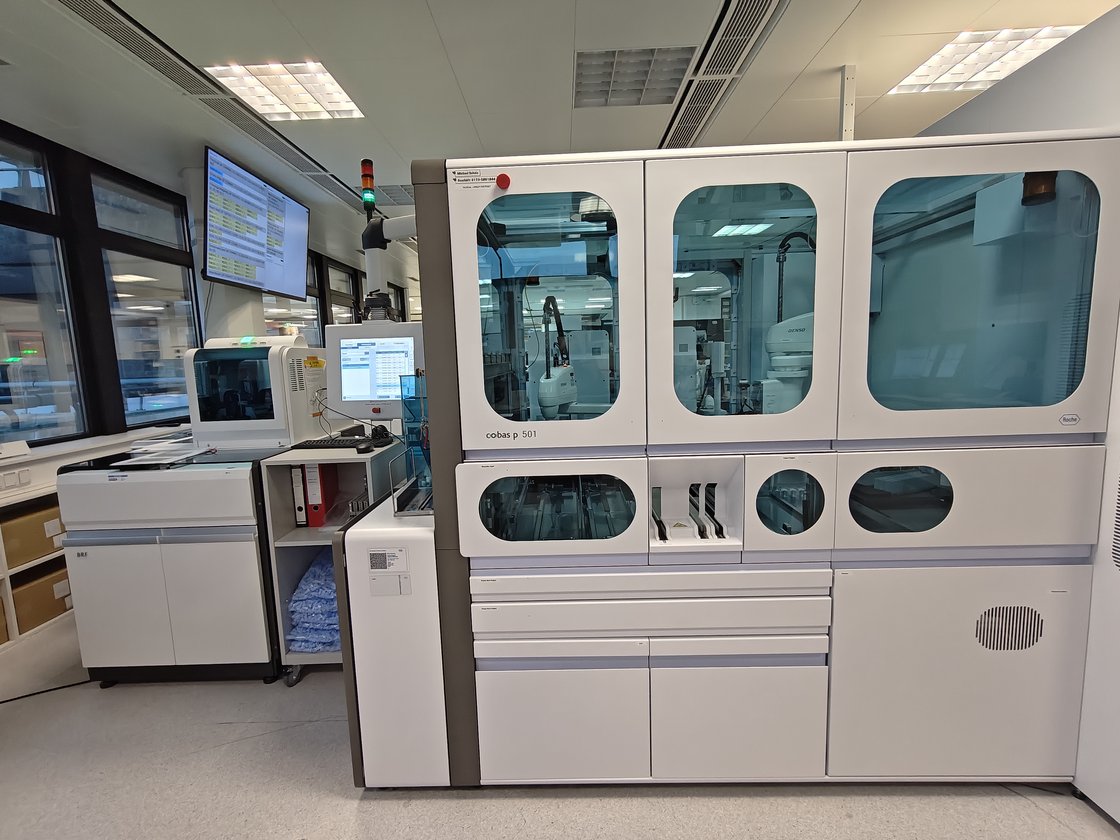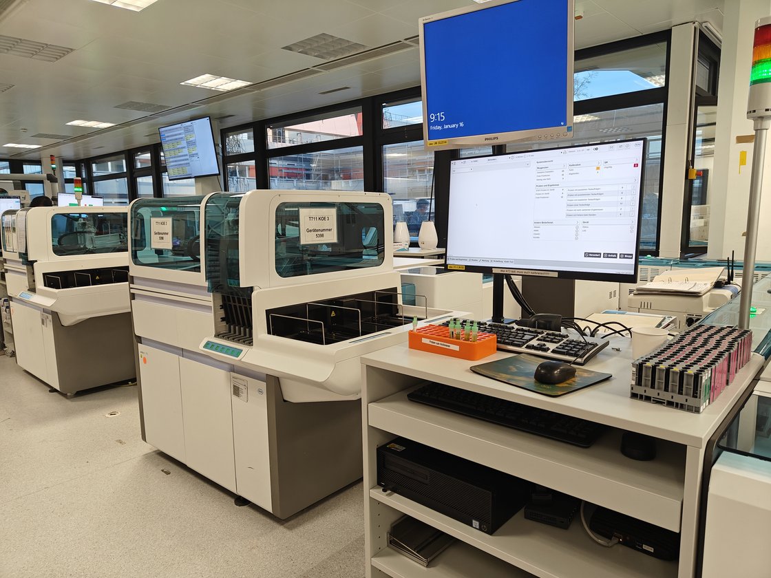 Die Zentrifugation dauert mindestens 10 Minuten und begrenzt die minimale Bearbeitungszeit dieser Proben. Damit sind die Proben zur Bearbeitung an den verschiedenen Arbeitsplätzen vorbereitet. Die meisten der sogenannten "klinisch-chemischen Untersuchungen" erfolgen an der Laboranalysenstrasse Cobas pro der Firma Roche, wobei der Begriff "klinisch-chemische Untersuchungen" mit dem Fortschritt der Technik fließend ist. Auf den modernen Geräten werden Substrate, Elektrolyte, Enzyme und Immunoassays bestimmt. Vor 10 Jahren wurden Herzinfarktmarker, Hormone und Tumormarker meist noch mit RIAs bestimmt. Die Bearbeitungszeit war dementsprechend lang. Die große Menge an Hormonbestimmung oder Herzinfarktmarker, wie Troponin, verlangt heute nach einer schnellen Abarbeitung. Bei der Bestimmung des intraoperativen Parathormons werden jetzt Bearbeitungszeiten um 20 Minuten erreicht. |