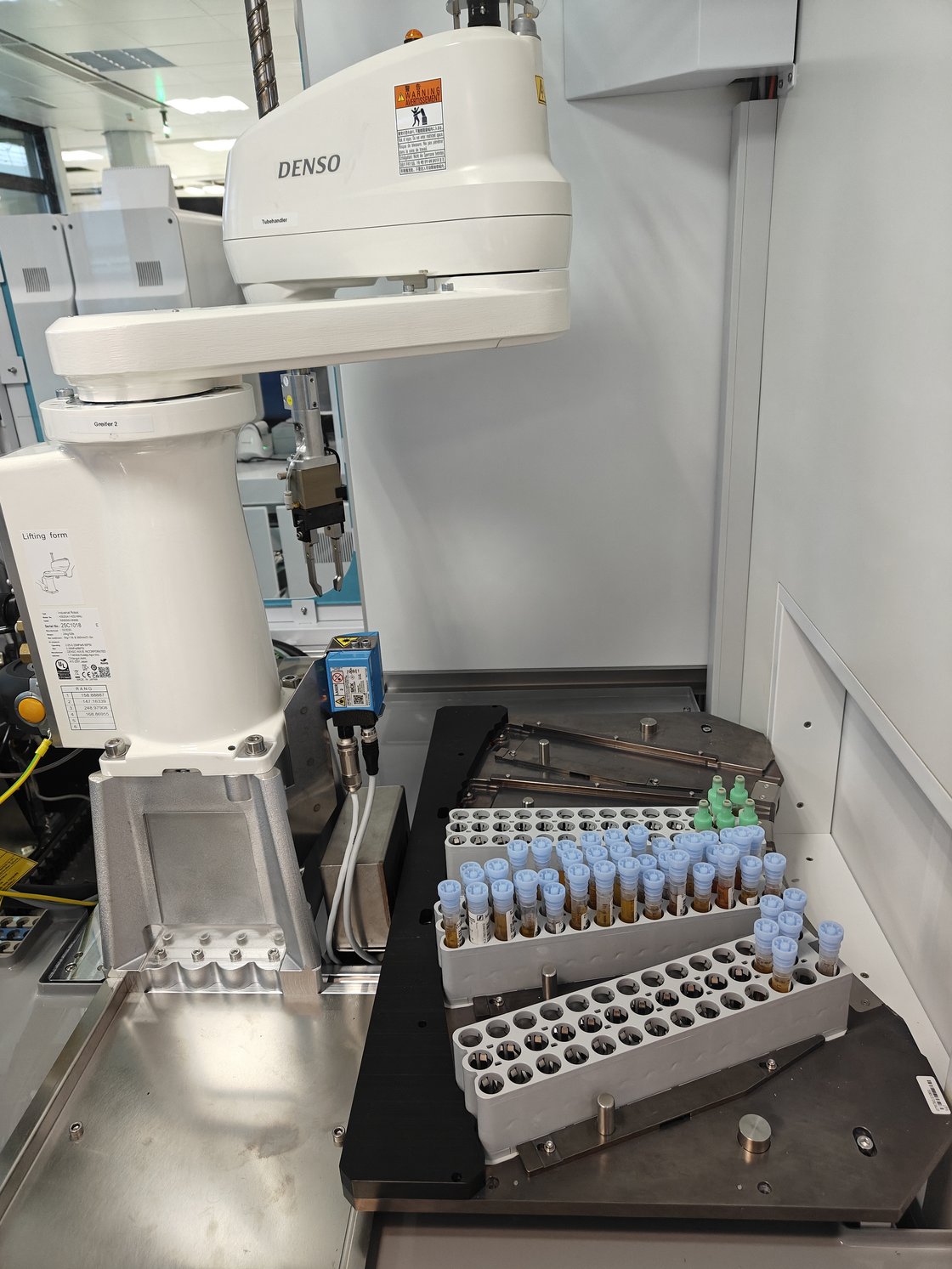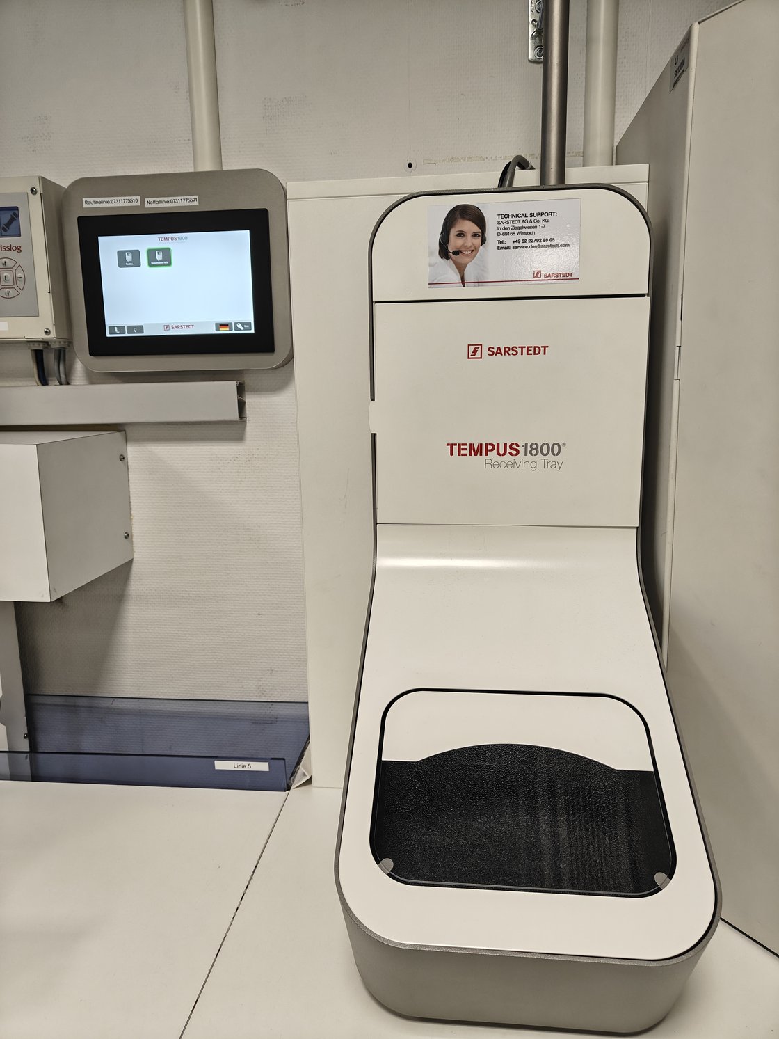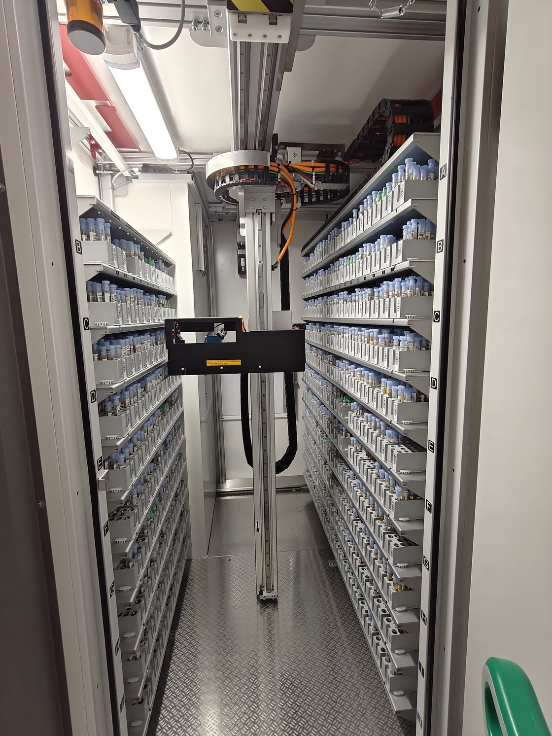 Wenn für eine Probe später noch ein Test nachgefordert wird, kann das entsprechende Röhrchen automatisch entnommen und direkt an das passende Analysegerät weitergegeben werden. Auch eine manuelle Entnahme ist möglich: Die Racks mit den betreffenden Probenröhrchen werden dazu automatisch in einen Ausgabebereich gebracht, wo sie entnommen werden können. Proben, die nur für eine bestimmte Zeit aufbewahrt werden dürfen, werden nach Ablauf dieser Zeit automatisch entsorgt. Die Proben stehen im Kühlschrank in speziellen Racks. Diese sind platzsparend gebaut. Die Temperatur im Schrank beträgt etwa 6 °C (plus/minus 2 °C).