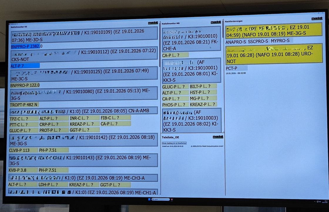 Alle Anforderungen erscheinen auf einem Statusmonitor. Die Farbkodierung weist auf den Dringlichkeitsstatus hin. Eine rot markierte Probe entspricht z.B. der vitalen Gefährdung. Im Rahmen der gesetzten Bearbeitungsfristen, für eine vitale Gefährdung z.B. 10-30 Minuten, wird der Farbton der Statusanzeige für die Anforderung zunehmend dunkler.