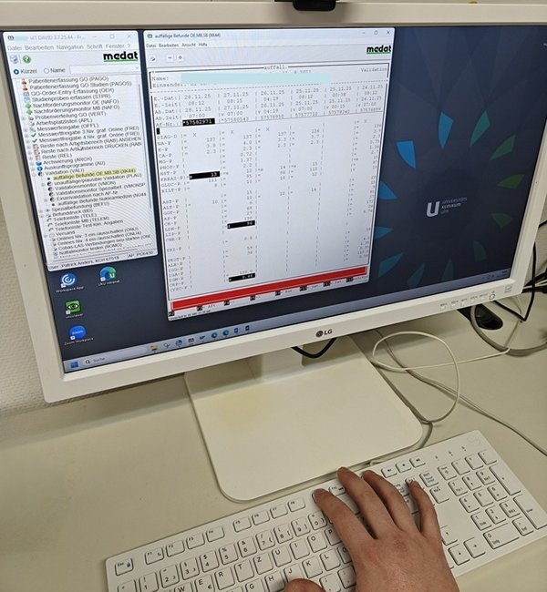 Nach der Analyse erfolgt eine technische Validation jeder Untersuchung durch die MTL. Am Bildschirm überprüft sie die Werte anhand der Vorwerte und der Lage zu anderen Untersuchungen im Anforderungsspektrum. Erst nach einer medizinische Validation jeder Untersuchung wird der Befund zur endgültigen Ausgabe freigegeben. Am Bildschirm erfolgt eine Überprüfung auf Richtigkeit und Plausibilität des gesamten Befundes innerhalb des einzelnen Befundes (horizontale Bewertung) und anhand der vorhandenen Vorbefunde (longitudinale Bewertung). Der Befund wird mit der Unterschrift des wissenschaftlichen Mitarbeiters endgültig freigegeben. |