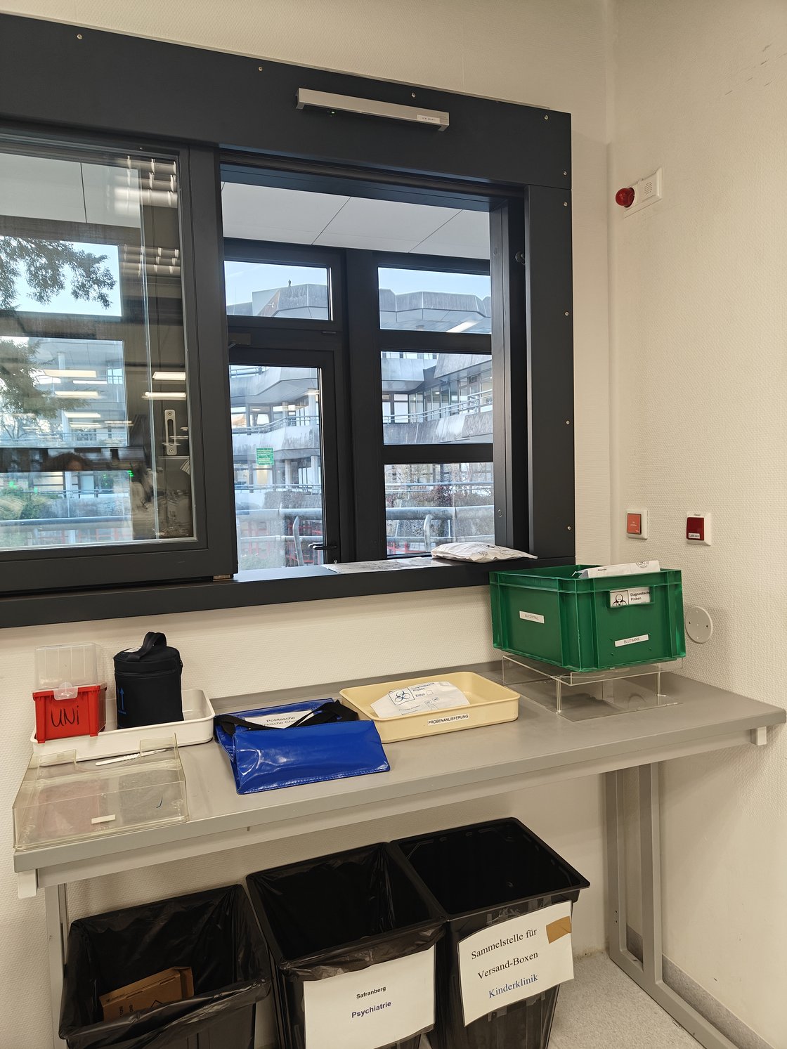 Die Proben werden entweder vom Klinikpersonal persönlich, vom Transportdienst oder von Taxifahrern abgegeben, oder erreichen uns per Post. Vitale Gefährdungen sollten möglichst direkt von Hand zu Hand übergeben werden. An die Rohrpost angeschlossene Einsender übermitteln ihre Proben über das Rohrpostsystem. Das Tempus-System ist für den Laborprobenversand vom Campusstandort Nord in die Zentrale Einrichtung Klinische Chemie (ZE Klinische Chemie) installiert. Bitte beachten Sie unsere Hinweise zum Probentransport. Sobald die Probe im Labor angekommen ist, wird Sie an einem Strichcodescanner erfasst. Das Laborinformationssystem (LIS) ordnet die Probe dem Auftrag aus der beleglosen Anforderung zu und bestimmt das Eingangsdatum. Wesentlich aufwendiger ist das Erfassen der Probendaten von einem Auftragsschein. |