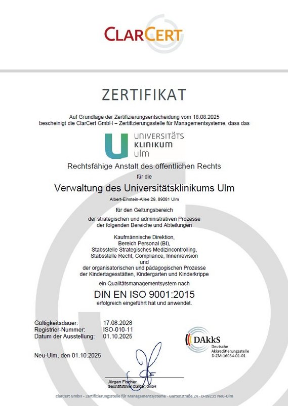 Gleich vier Bereiche des Universitätsklinikums Ulm (UKU) haben kürzlich die Zertifizierung nach der sogenannten DIN EN ISO 9001:2015 erhalten. Ein Meilenstein: Mit den vier Verwaltungsbereichen blickt das Universitätsklinikum nun auf insgesamt 16 Einrichtungen erfolgreich zertifizierte Einrichtungen.