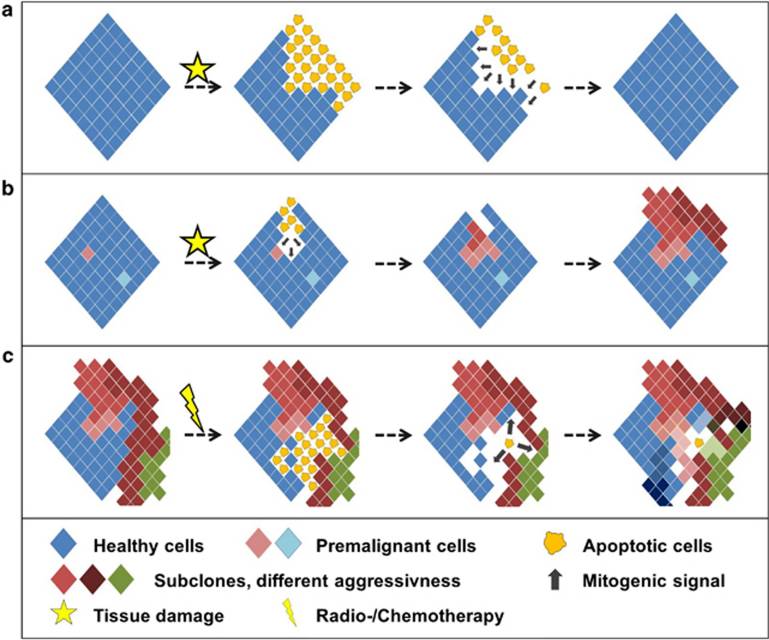 There is, however, emerging evidence that apoptosis of premalignant cells does not always act as a barrier against malignant transformation but rather can drive compensatory proliferation and selection of individual clones. This drives, on a long run, genomic instability and facilitates the emergence of malignant clones (Figure 1). In a mouse model of dyskeratosis congenita, we indeed could show that apoptosis drives both bone marrow failure and leukemia: Genetic inhibition of PUMA-induced apoptosis was sufficient to maintain hematopoeisis and genomic stability in this model system for bone marrow failure (Molnar et al, Cell Death Diff, 2025).