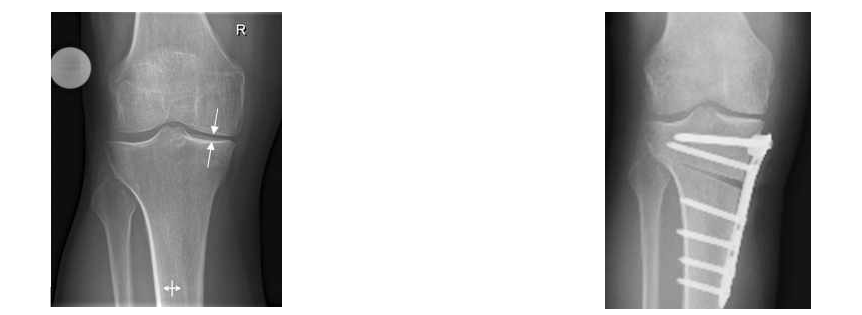 Die häufigste Fehlstellung an der unteren Extremität ist ein sog. O-Bein. Durch eine Umstellungsoperation mittels eines „Knochenschnitts“ am Schienbeinkopf kann die O-Bein-Fehlstellung korrigiert und die einwirkende Last gleichmässiger im Kniegelenk verteilt werden.