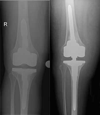 Das Kniegelenk besteht aus drei Gelenkkompartimenten: einem inneren, zentralen und äußeren Kompartiment. Die Kniescheibe bildet ein Widerlager und gleitet über den Oberschenkelknochen. Prinzipiell ist ein isolierter oder kombinierter Verschleiß vom inneren oder äußeren Gelenkkompartiment sowie auch dem Kniescheibenwiderlager möglich. Erkennt man die Erkrankung früh genug und ist der Leidensdruck entsprechend, so kann man die einzelnen Kompartimente isoliert ersetzen, wie Abb. 2 und 3 zeigen.