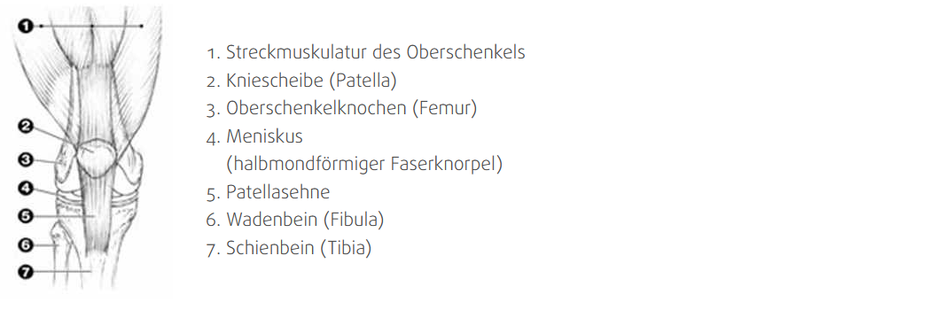 Wenn wir gehen, stehen, hocken oder sitzen, bewegen wir das größte Gelenk des Körpers: das Kniegelenk. Es verbindet den Oberschenkelknochen mit dem Schienbein, die artikulierenden Gelenkflächen sind dabei die Oberschenkelrolle und der Schienbeinkopf. Ein Teil des Kniegelenks wird durch die Kniescheibe gebildet, die als Unterstützpunkt für die Kraftentwicklung der Quadrizepsmuskulatur dient. Das Kniegelenk kann im Wesentlichen nur in einer Ebene (Streckung/Beugung) bewegt werden. Nur am gebeugten Knie ist noch eine minimale Rotationsbewegung des Unterschenkels gegenüber dem Oberschenkel möglich. Als Gleitfläche sind die Gelenkpartner mit Knorpel überzogen, das Gelenk wird durch eine Kapsel abgedichtet, innerhalb derer zur Reduktion des Widerstandes und der Ernährung des Knorpels Gelenkschmiere durch die Gelenkinnenhaut gebildet wird. Ähnlich einem Stoßdämpfer wirkt dieses hydraulische Prinzip und wird unterstützt durch die Menisci: halbmondförmige knorpelige Scheiben, die innen und außen zwischen den Gelenkflächen liegen.