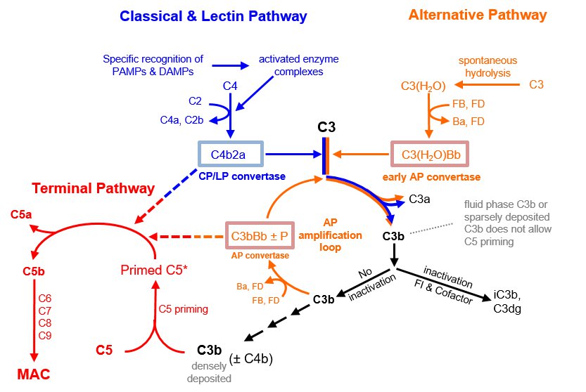 Tight regulation of the pivotal C3-convertases – and in particular of the AP-amplification loop C3-convertase – is of crucial importance and under-regulation of this central step leads to severe tissue damage and is the underlying and/or aggravating factor of many rare and common disease conditions such as e.g. paroxysmal nocturnal hemoglubinuria (PNH), atypical haemolytic uremic sundrom (aHUS), age related macuar degeneration (AMD), asthma, rheumatoid arthritis, systemic lupus erythematosus, multiple sclerosis, Alzheimer’s disease, ischemia-reperfusion injury, transplant rejection. Complement activation must be spatially and temporarily limited in order to avoid damage to normal self as a consequence of excessive widespread, and prolonged activation (which also leads to exhaustion of complement proteins in one event and consequently to unresponsiveness to later events). Under normal, physiological conditions the level of complement activation and associated immunological outcome ideally is dependent on the nature of the initiating stimulus. A) On pathogens complement acts as the first responder of the immune system in a robust and unrestricted activation profile promoting clearance, inflammation and consequently immunity: Insufficient regulation of the C3-convertases on pathogens leads to massive C3-opsonisation, followed by the assembly of C5-convertases, which process the complement C5 protein into the very potent anaphylatoxin C5a and C5b. While C5a promotes inflammation, mast cell degranulation and leucocyte migration to alert all branches of the immune system, C5b associates with the complement components C6, C7, C8 and multiple copies of C9 to form the membrane attach complex (MAC) which punches holes into cells eventually resulting in lytic cell death. (i.e. raising alarm within the entire immune system). B) On altered self (e.g. apoptotic and injured cells, debris) complement promotes a limited, more regulated activation profile resulting in mild inflammation, but preventing immunity and thus supports house-keeping functions: Intense regulation of the C3-convertases stops the complement cascade from progression into the detrimental lytic pathway, but allows – to varying extent - particles and molecules to be coated with opsonin C3b and Factor I-processed inactivation products of C3b: iC3b, C3dg, C3d. Coating with opsonins facilitates clearance and uptake of antigens by professional phagocytotic cells, enhanced antigen presentation, lowering of thresholds for B-cell activation (T-cell dependent and independent B-cell activation). C) On normal self (e.g. healthy cells) complement activation is limited to the baseline activation of the alternative pathway. In the presence of regulators this low level surveillance-activation is insufficient to raise inflammation and immunity. |