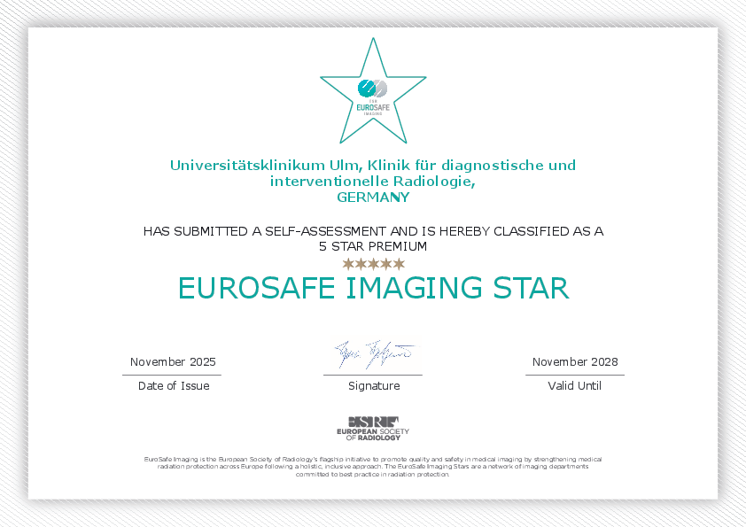 Wir verwenden ein modernes Dosismanagementsystem, welches die Strahlenexposition unserer Untersuchungen kontinuierlich überwacht und auswertet. Dabei orientieren wir uns an den Diagnostischen Referenzwerte des Bundesamtes für Strahlenschutz. Durch die stetige Analyse unserer Dosisdaten sowie der Bildqualität unserer Untersuchungen erfolgt eine Optimierung der Untersuchungsprotokolle. Wir können somit die in der Tabelle oben erwähnten Dosiswerte in der Regel deutlich unterschreiten. Für die Dosisoptimierung unserer Untersuchungen und weitere Themen des Strahlenschutzes kümmert sich unser Team von Medizinphysik-Experten. Für Ihre Fragen zum Strahlenschutz in der Radiologie stehen sie Ihnen zur Verfügung (mpe.rad1@uniklinik-ulm.de).