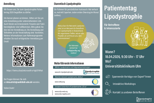 Der Lipodystrophie Patiententag findet dieses Jahr in Ulm statt, in Zusammenarbeit mit dem Patientennetzwerk NetLip und dem Deutschen Referenznetzwerk Lipodystrophie (Uniklinik Leipzig und Ulm). Details zum Programm und zur Organisation finden Sie im Flyer.