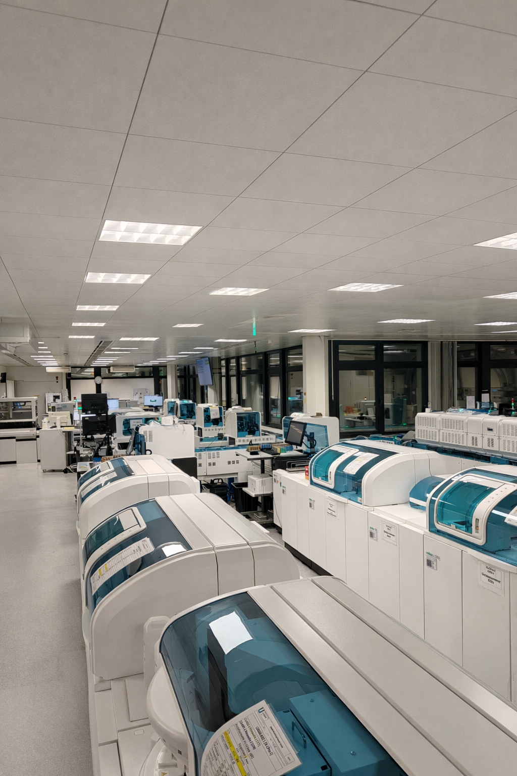Die Zentrifugation dauert mindestens 10 Minuten. Dadurch wird die kürzeste Bearbeitungszeit dieser Proben festgelegt. Danach sind sie bereit für die Untersuchung an den verschiedenen Arbeitsplätzen im Labor. Die meisten sogenannten klinisch-chemischen Untersuchungen werden heute auf der Labor-Analysenstraße. Die Labor-Analysenstraße ist ein automatisches System, bei dem mehrere Geräte hintereinander geschaltet sind. So können viele Proben nacheinander schnell und genau untersucht werden. Mit neuer Technik kommen immer mehr Untersuchungen hinzu. Auf modernen Geräten werden z. B. Substrate, Elektrolyte, Enzyme und Immunoassays gemessen. Früher, vor etwa 10 Jahren, wurden viele Bestimmungen wie Herzinfarktmarker, Hormone oder Tumormarker noch mit anderen Verfahren gemacht. Das dauerte deutlich länger. Heute ist eine schnelle Bearbeitung möglich – etwa bei Troponin (Herzinfarktmarker) oder bei Hormonuntersuchungen. |